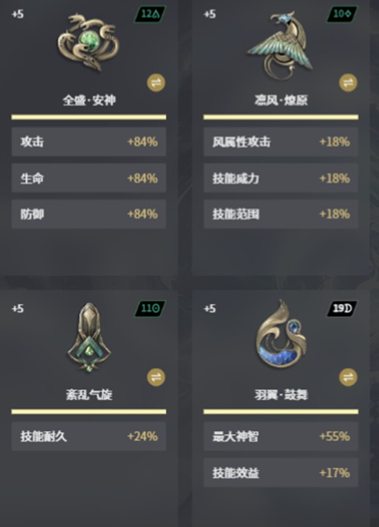 剩余位置推荐搭配羽翼永恒,提供24%最大神智与18%技能耐久。神智值的提升有助于维持技能循环的顺畅,避免因神智不足导致输出中断。同时叠加技能耐久后,达芙涅释放技能的频率更高,配合原本232%的基础技能耐久,几乎可以做到无缝衔接技能释放。这一组合属于百搭型配置,无论何种战斗环境都能保持稳定输出节奏。