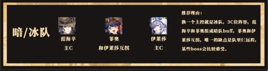 菲奥与伊莱莎同属暗系背景,但二者在冰队中可产生特殊的互拐效果。当两人同时在场时,菲奥的终结技可为伊莱莎提供高达20%的远程输出增益,进一步放大冰系爆发。这一联动机制使得队伍在面对高血量目标时更具压制力。尽管三者均为远程角色,可能在近战机制关卡中略显乏力,但通过合理站位与技能释放时机,仍能有效规避部分短板。