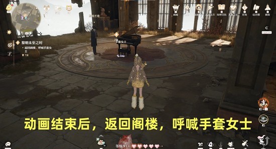 走进,进入动画,结束后,前往行宫中心摆放小提琴雕像处;