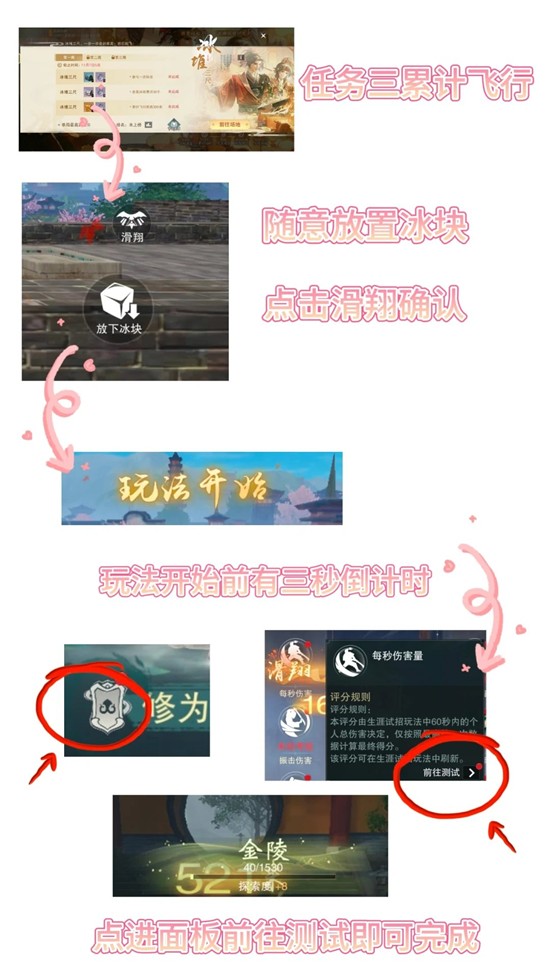 这里解释一下,就是随意放置一个冰块,点击滑翔之后,会进入三秒倒计时,滑翔玩法才会开始,三秒倒计时时间内,点进个人面板,点击修为左边的那个符的图案,然后每秒伤害量点击前往测试即可传送至金陵木桩,秒完成500米的距离,任务三完成