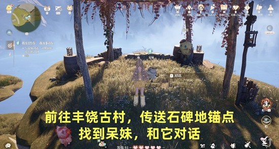 跟随指引,传送到 石碑地 锚点,前往丰饶古村,找到呆妹,和它对话;