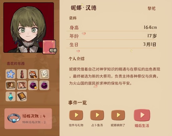 妮娜身为神官,信仰与艺术是她生活的重要组成部分。她最喜欢的礼物是勿忘我和睡火莲,前者增加4点好感,后者增加5点。此外,她还对火山女神的木雕和唱诗班乐谱集有特殊反应,这两样物品无法通过常规途径获取,必须通过其他NPC赠与或任务奖励获得。因此,在与其他角色互动时留意是否有相关物品掉落,将有助于后续向妮娜送礼。