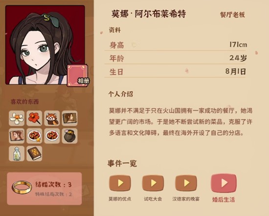 莫娜是镇上的厨师,性格热情且热爱生活。她最喜欢的礼物是睡火莲和勿忘我,睡火莲可增加5点好感,勿忘我增加2点。她还对扶桑花发饰和催眠药水有特殊好感反馈。扶桑花发饰由贝利卡赠送获得,属于剧情物品;催眠药水则需玩家解锁魔药技能后自行调配。建议在技能树中优先发展魔药相关分支,以备不时之需。