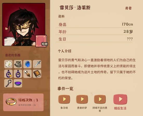 雷贝莎作为勇者,性格刚毅且富有冒险精神。她最喜欢的礼物包括茉莉花、银匕首和野猪,这些物品都能有效提升她的好感度。此外,随着主线剧情推进,玩家会陆续获得奴隶脚铐和恶魔浓汤等专属物品,这些均可用于赠送给雷贝莎,触发隐藏剧情与额外好感增长。建议保持主线进度畅通,及时收集并使用这些特殊赠礼。