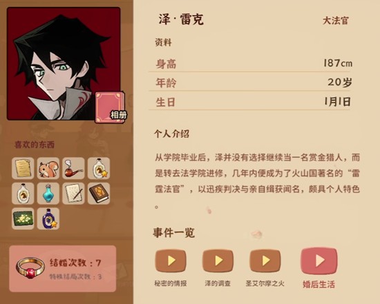 泽是王国的大法官,理性且博学。他对金块和睡火莲情有独钟,两者均可增加10点好感度,是非常理想的礼物选择。魔物研究笔记和棕色烟斗也能带来一定好感提升,但获取条件较为特殊——需要先提升朗和妮娜的好感度才能获得。因此,建议前期多与这两位角色互动,为后续向泽送礼做好准备。