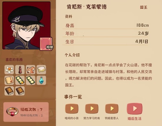 肯尼斯是王位继承人之一,性格温和且富有同情心。他最喜欢的礼物是野花、红玫瑰和睡火莲。其中睡火莲可增加5点好感,红玫瑰增加4点,野花虽增幅较低但易于获取。除了送礼外,还可通过图书馆邀约与其交谈,回顾过往经历,借此获得大量好感度加成。这种非物品类互动方式同样重要,不应忽视。
