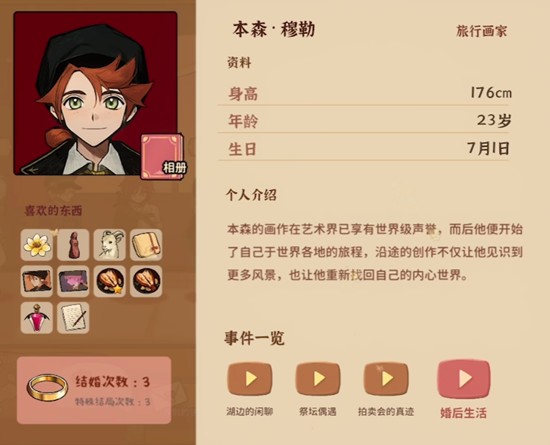 本森是镇上的画家,艺术是他生活的全部。他最喜爱的礼物是金色兰花和火山女神木雕,这两样物品都能显著提升好感。此外,任意一幅画作均可作为有效赠礼,这意味着玩家可通过制作或收集画作来稳定维持与他的关系。由于画作可重复使用,建议在工坊中多备几幅以备长期需求。