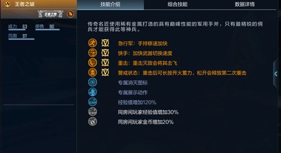 作为顶级王者近战武器,王者之破轻击伤害79,轻击爆头伤害高达190,轻击距离达到了1.31米,在手斧系列中位居榜首,轻轻松松就能直接将对手带走。