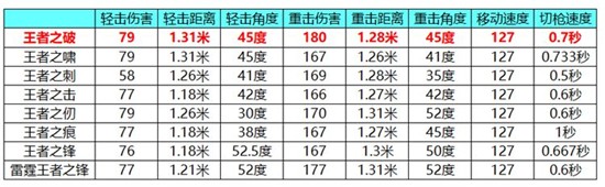 与其他王者近战作对比,可以看到王者之破有着1.31米的轻击距离,和1.28米的重击距离,比王者之啸还要强一些。轻击伤害79,重击伤害180,在同系列中已经站在了顶峰。由于手斧系列的特殊性,在切枪速度方面要稍差一些。单从伤害、攻击范围攻击距离来看,王者之破可以说是一把非常不错的刀战利器。