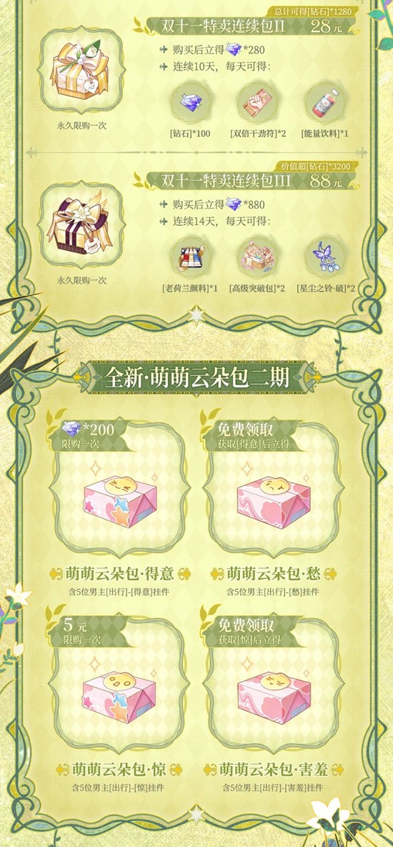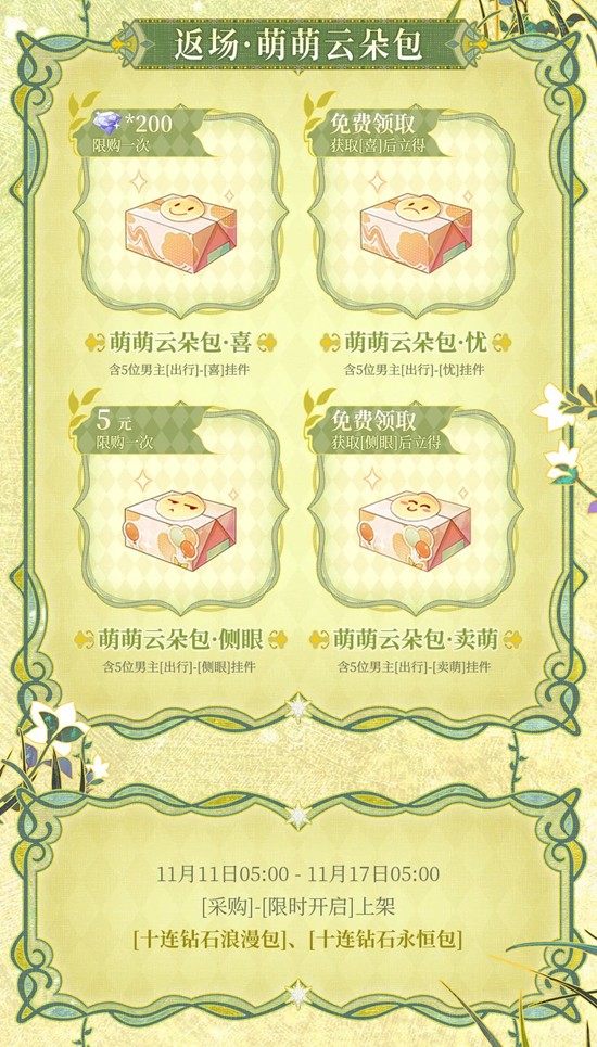 ► 购买本期「季旅专列」,可以在[采购]-[限时开启]中免费领取一个[萌萌云朵包],详情可留意后续宣发。