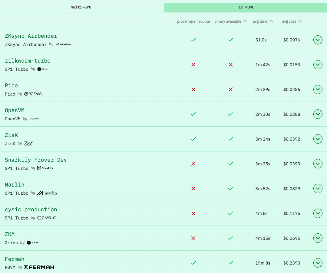 或许很多人都不知道,ZKsync 推出的开源 zkVM ZKsync Airbender 是单 GPU 验证速度最快的 zkVM。据 Ethproofs 资料,使用单张 4090 ZKsync Airbender 平均验证时间 51 秒,成本不到一美分,二者均是 zkVM 中最佳成绩。