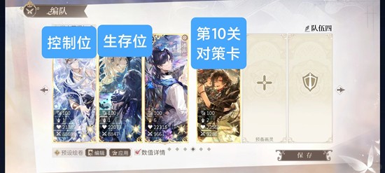 基本组队公式如p2,1号位上一个可以清条/冻条/禁特/冰冻的控制卡,2号位上奶卡,3号位放我们的大腿葳蕤,后面放三张自己box里剩下的卡里最强的用来替补。