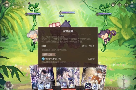 第15关:注意白色像素猴的机制,小技能会驱散猴子们身上的禁特和冰冻,所以尽量避开在白猴子开技能的回合使用禁特技能和葳蕤大招,否则会浪费一个冰冻,生存上可能有压力