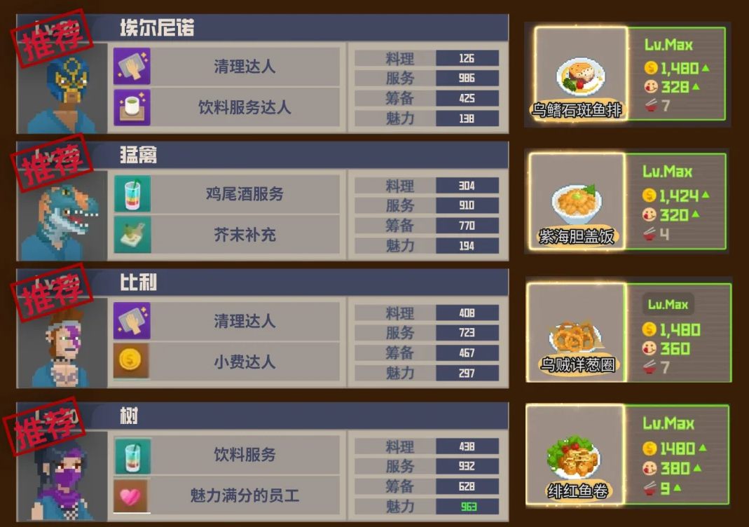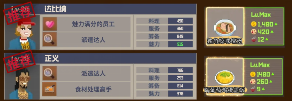 潜水员戴夫厨房中推荐的员工有米仓、真纪、詹姆斯、拉乌尔;大堂中推荐的员工有埃尔尼诺、猛禽、比利、树;派遣推荐的员工有达比纳、正义;经理推荐的员工是德瑞。