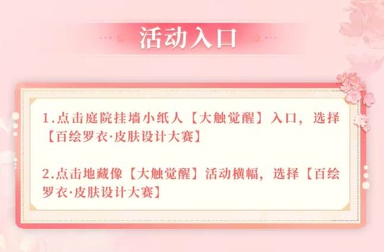 玩家可以通过点击庭院挂墙小纸人或地藏像【大触觉醒】入口,选择【百绘罗衣·皮肤设计大赛】进入投票页面。作品将默认随机展示,玩家可以手动选择展示偏好或搜索指定作品。
