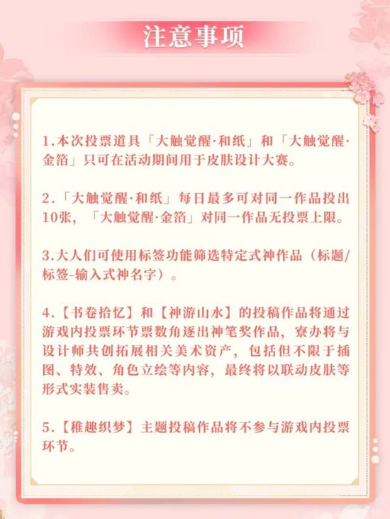 需注意的是【稚趣织梦】主题投稿作品不参与游戏内投票环节。阴阳师公开课相关作品仅参与神笔奖评选,不参与其他非投票奖项评选。