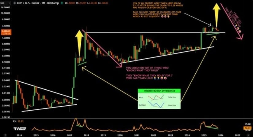 尽管短期指标偏空,XRP月线图却浮现隐藏看涨背离。分析师@jaydee_757指出:"XRP月度低点逐步抬高,而RSI指标形成更低低点,若2.09美元支撑稳固,可能延续看涨趋势。"