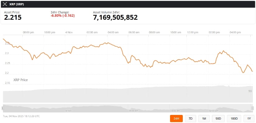 截至发稿,XRP报价约2.21美元,24小时跌幅6.80%。来源:Brave New Coin XRP价格