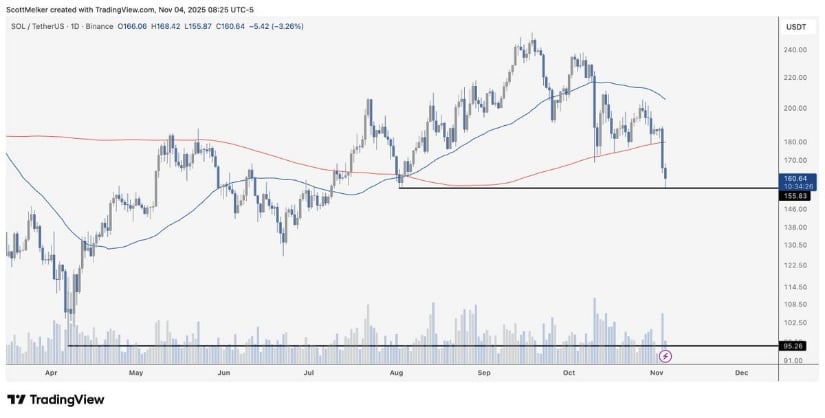 Solana在155.83美元附近守卫最后支撑,该价位将决定趋势是复苏还是滑向深度回调。来源:华尔街之狼(X平台)