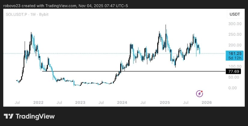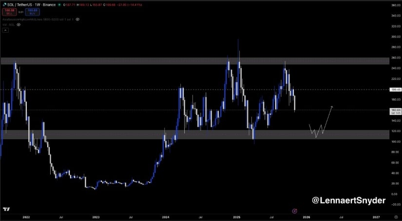 Solana周线结构显示可控回调,122美元正成为耐心买家的下一重要吸筹区。来源:Lennart Snyder(X平台)