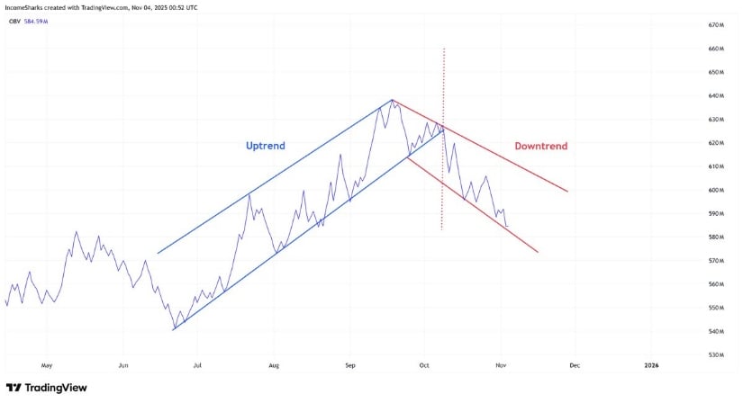 Solana的OBV趋势下破,预示短期吸筹乏力且卖压增强。来源:IncomeSharks(X平台)