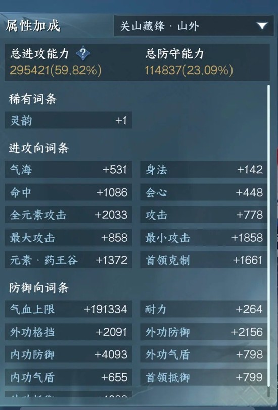 灵韵是2词条破霄(上赛季前后80万五行元气才赌出来,没想到2个月就淘汰了55555),开引灵阵后内功分会变高,这是裸面板。