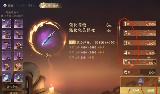 2.强化,不要补缀不要补缀!什么是补缀?不足200%你再去点第二次就叫补缀,我们雨露均沾,先把所有位置都点到5级,不足200%也别管它,就这样先放着!!强化顺序:武器>手套>饰品们>其他。