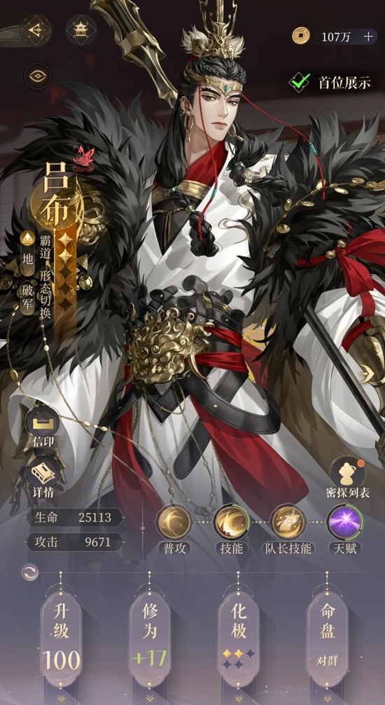 一星吕布主要是要叠伤害,这关叠到9过后不要着急开大,继续凹几回,把敌方吕布的血尽量打到差不多半血,因为咱们可能练度不高,咱们可能星石也不算完美,要一次把所有人解决,就先把吕布打到半血