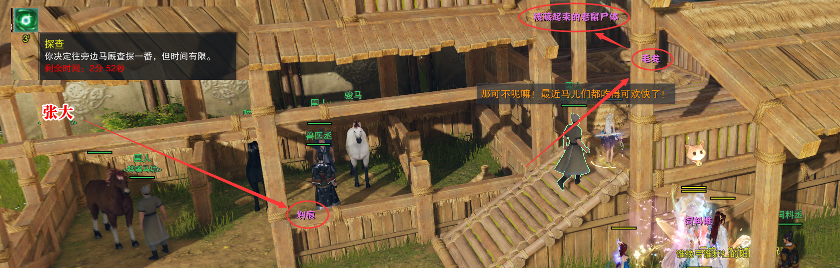 3、对话完【张大】之后得到一个3分钟的“探查buff”,分别互动马厩中的【划痕】、【毛发】、【被藏起来的老鼠尸体】,buff如果消失了可以再次对话张大重新获得buff