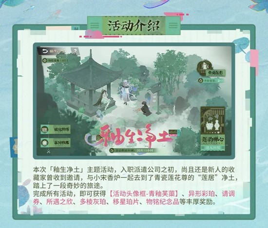 物华弥新本次「釉生净土」主题活动,入职派遣公司之初,尚且还是新人的收藏家曾收到邀请,与小宋香炉一起去到了青瓷莲花尊的“莲居”净土,踏上了一段奇妙的旅途。完成所有活动,即可获得【活动头像框-青釉芙蕖】、异形彩珀、请调券、所遇之欣、多棱灰珀、移星珀片、物铭纪念品等丰厚奖励。一起来和小编看看吧~