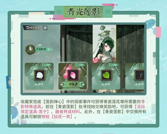 收藏家完成【莲韵禅心】中的探索事件可获得青瓷莲花尊所需要的寻影特殊道具,前往【青瓷莲影】处寻找她交换奖励吧,可获得【活动限定道具-莲子】、器者养成材料。此外,在【青瓷莲影】中交换所有道具可解锁物铭【拈花一笑】。