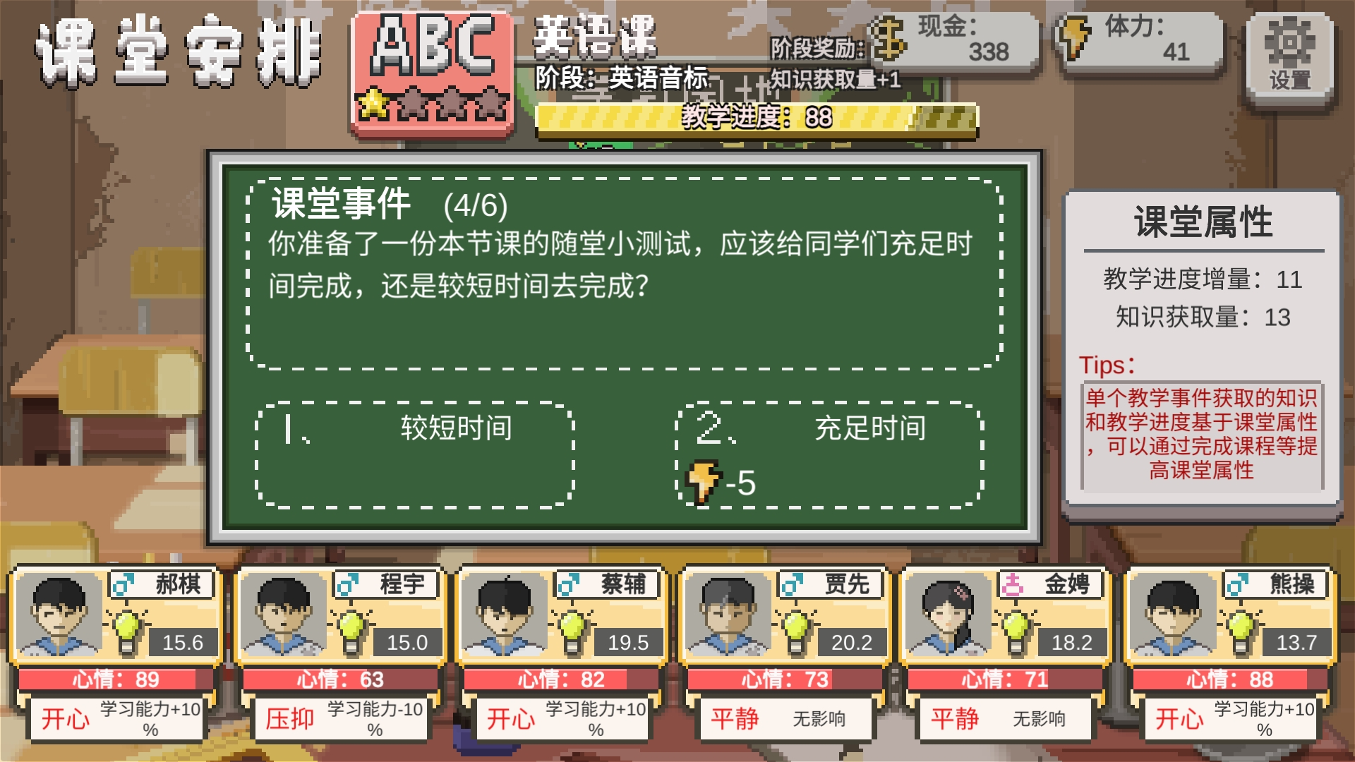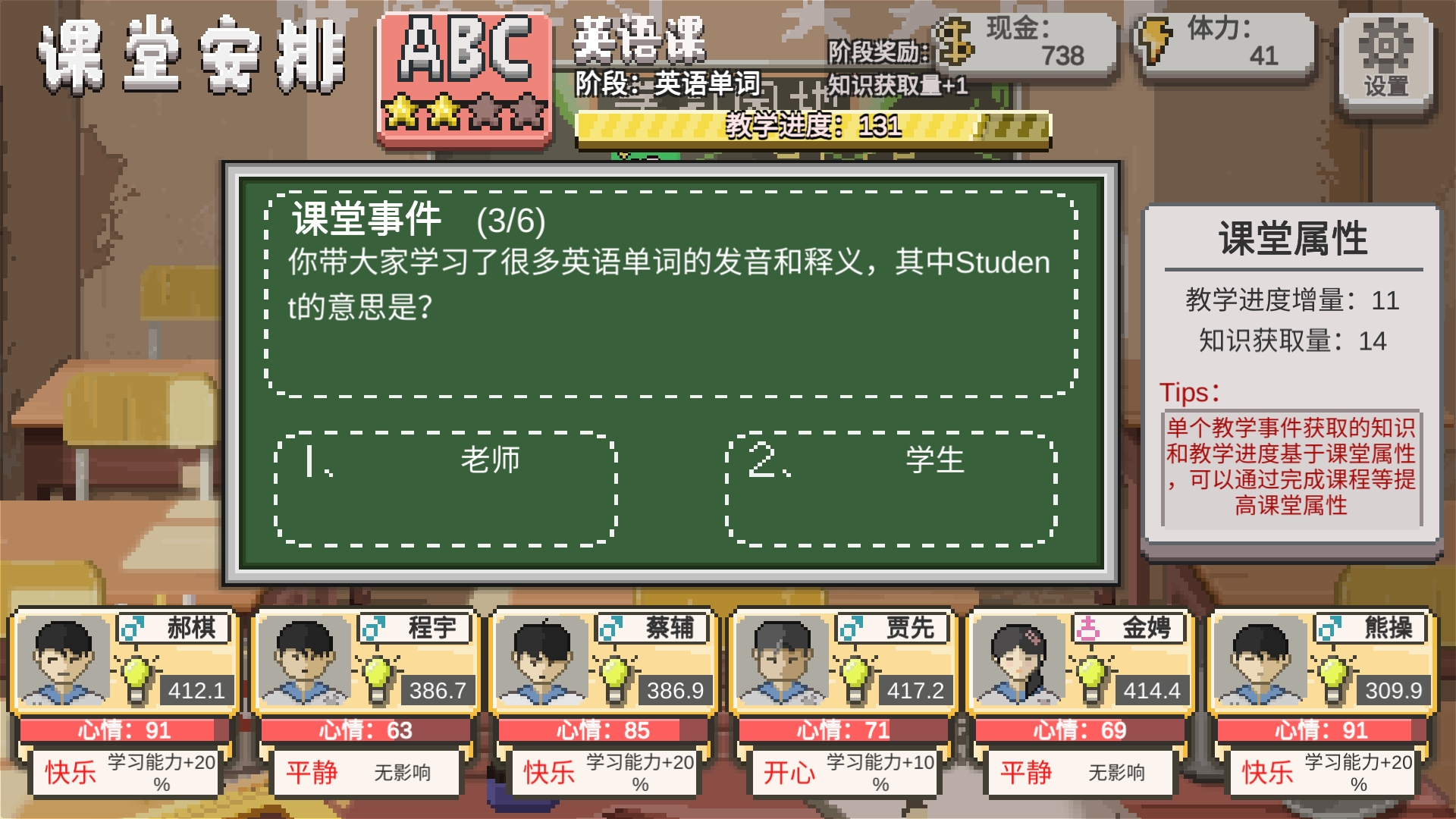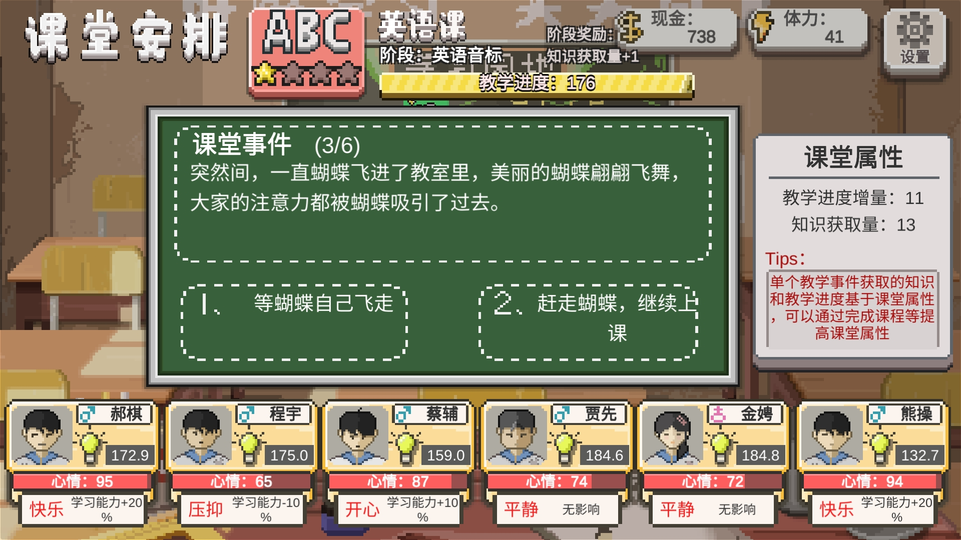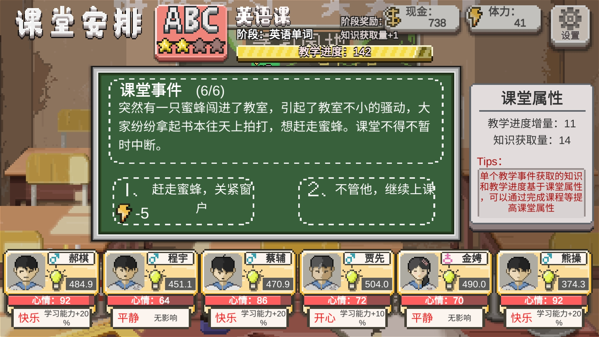 12、突然有一只蜜蜂闯进了教室,引起了教室不小的骚动,大家纷纷拿起书本往天上拍打,想赶走蜜蜂。课堂不得不暂时中断?选第一个加知识和心情,选第二个加知识进度