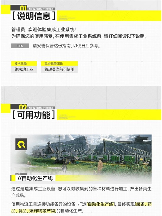 明日方舟:终末地游戏中玩家将成为终末地工业的管理员,率领您的干员们,保卫、拓展人类的边疆。探索塔卫二,收集资源,利用集成工业系统攻克险境,管理员,欢迎体验集成工业系统!为确保您的使用感受,在使用集成工业系统前,请仔细阅读以下说明。