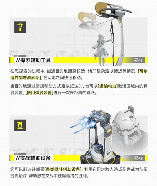 在您探索的过程中,如遇目的地距离较远、地形复杂难以接近等情况,[可制造并部署滑索架],在两地之间快速移动。当目的地通过常规移动方式难以抵达时,也可以[运输电力]激活区域内的弹射装置,[使用弹射装置]进行一次长距离的跳跃。