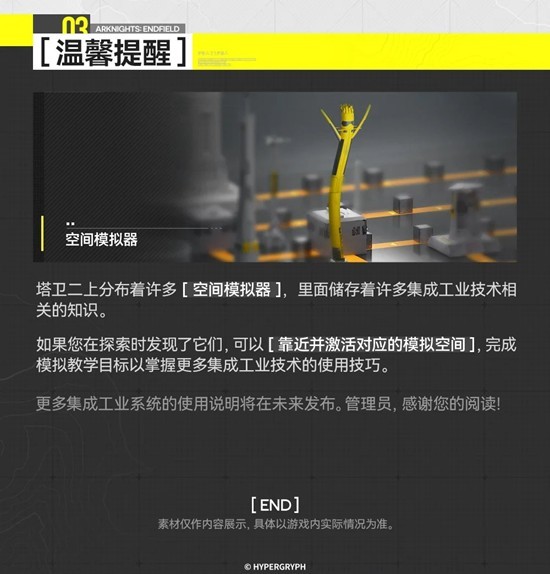 如果您在探索时发现了它们,可以[靠近并激活对应的模拟空间]完成模拟教学目标以掌握更多集成工业技术的使用技巧。