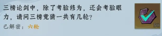 8、三榜论剑中,除了考验修为,还会考验眼力,请问三榜竞猜一共有几轮?六轮