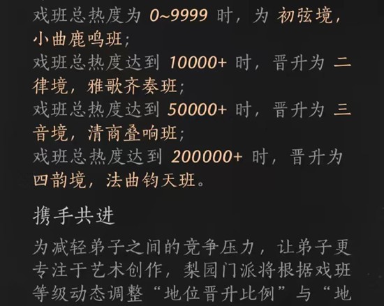 江湖中人,皆有所求。有人为名利奔走,有人为威权沉沦,只有很少的人能够从一而终,遵循自己澄澈内心行事。梨园弟子,就是这样一群纯粹的人。再多的财富,都比不过乐舞的精进与知音的赏识。那么游戏中梨园门派应该怎么晋升呢?小编为你准备了一份攻略,一起来看看吧~