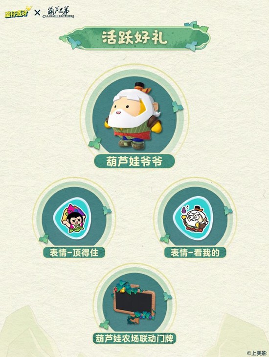 除了葫芦娃外观,还有更多联动内容等你来探索。外观-蛤蟆小兵、冥蛇佩姬典藏联动皮肤-蛇精、表情-魔力转圈圈等都将在活动中返场。此外,参与揪揪扭蛋机抽取,还有机会获得配饰-七彩山、背饰-祖雕铜壶、动作-我吸、动作-千里眼顺风耳等丰富奖励。