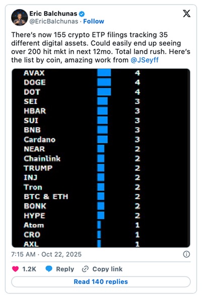According to Bloomberg, roughly 155 crypto-related ETF filings have flooded the market since 2024, a wave largely ignited by the success of Bitcoin and Ethereum (ETH) ETFs—which now manage around $150 billion and $20 billion in assets, respectively.