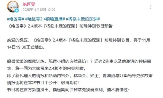 让我们共同期待11月14日的到来,一起揭开《绝区零》2.4版本的神秘面纱。记得预先关注官方直播频道,我们周五见!