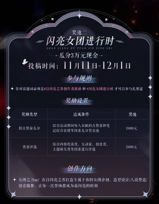 参与方式:点击「以闪亮之名」小红书账号主页,点击【群聊】,找到「以闪亮之名创作者招募群」进行申请,申请后将由游戏官方进行审核,请关注通过消息提醒。
