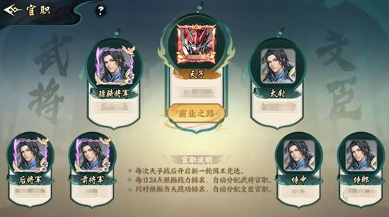 随着国战系统的开启,官职体系也同步上线。武官职位依据玩家战力排名分配,战力高者优先担任要职;文官则按积累的战功排序,战功越多越有机会获得高位。初始阶段,战力最高的玩家将自动登基为王,后续国王需通过天子战决出,并经由同国玩家投票确认。世子一职由现任国王指定任命。这些设定增强了百战群英中国战的组织性与归属感,也让每位参与者都能在国家发展中扮演重要角色。以上就是百战群英国战玩法的详细介绍,希望phpfans带来的这篇攻略能帮你快速融入战场。