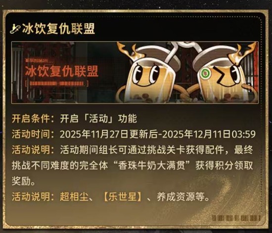 开启条件:开启「活动」功能。活动时间:2025年11月27日更新后至2025年12月11日03:59。活动期间,玩家可以通过挑战关卡获得配件,最终挑战不同难度的完全体“香珠牛奶大满贯”获得积分领取奖励,包括超相尘、「乐世星」、养成资源等。