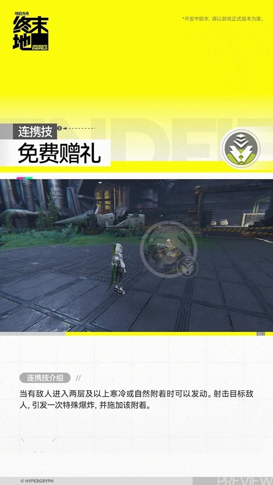 当有敌人进入两层及以上寒冷或自然附着时可以发动。射击目标敌人,引发一次特殊爆炸,并施加该附着。