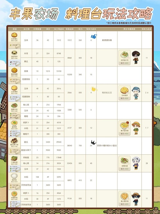 第二个表格粗略的算了一下四种热门蔬果口粮的成本,对比起来做菜恢复体力还是比较划算的,而且更有互动和趣味。