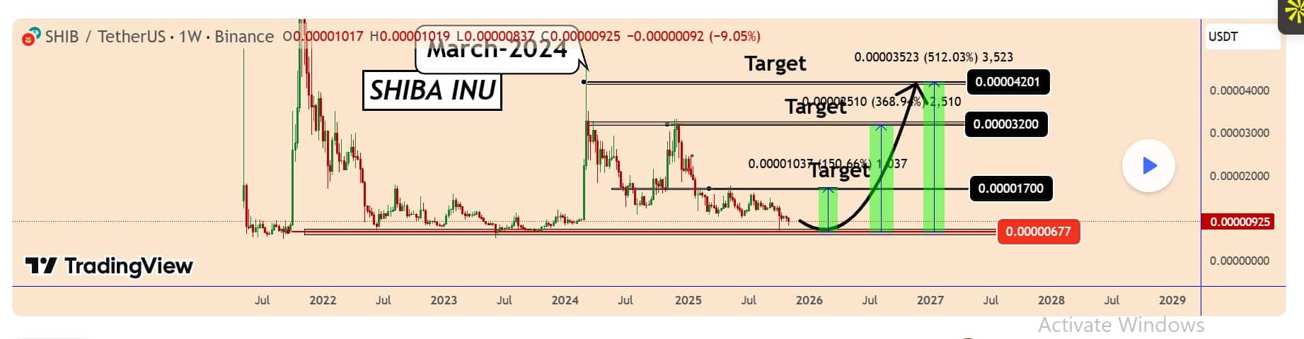 分析师强调该支撑区是SHIB近些年触及的最低交易带之一,并指出其在过往周期中屡次引发看涨反转。