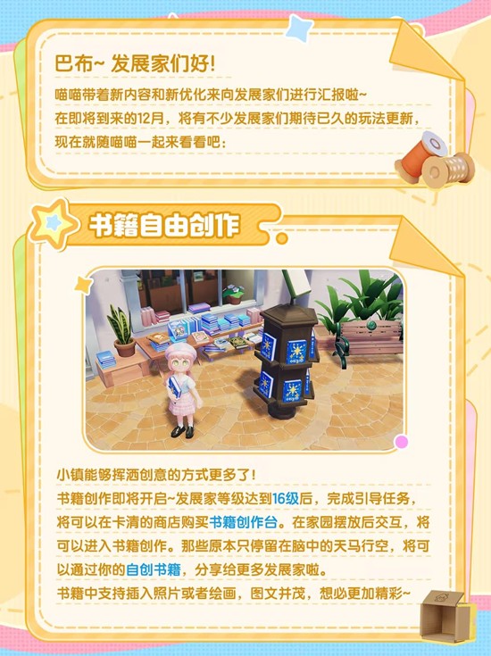 心动小镇即将开启书籍创作功能,让玩家的创意不再局限于建筑和装饰。当玩家的发展家等级达到16级后,完成引导任务,即可在卡清的商店购买书籍创作台。玩家可以在家中摆放书籍创作台,进入书籍创作模式,将那些原本只停留在脑中的天马行空的想法,通过自创书籍分享给更多的发展家。书籍中支持插入照片或者绘画,图文并茂,想必更加精彩。