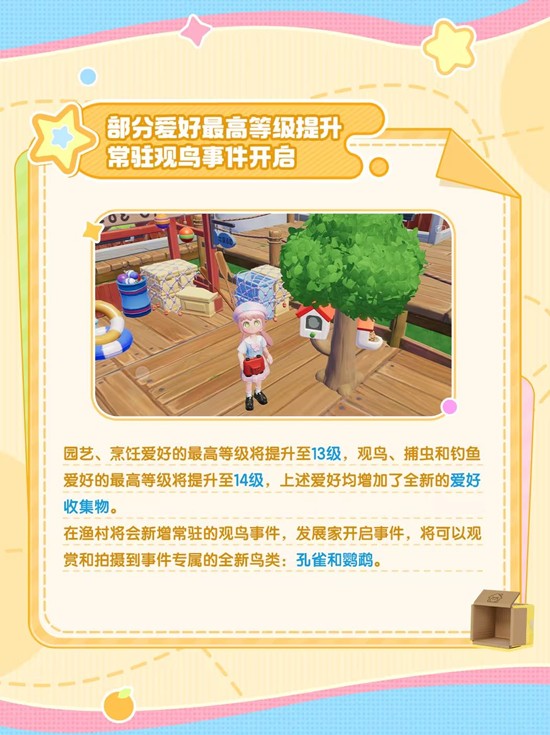 园艺、烹饪爱好的最高等级将提升至13级,观鸟、捕虫和钓鱼爱好的最高等级将提升至14级,上述爱好均增加了全新的爱好收集物。在渔村将会新增常驻的观鸟事件,发展家开启事件,将可以观赏和拍摄到事件专属的全新鸟类:孔雀和鹦鹉。