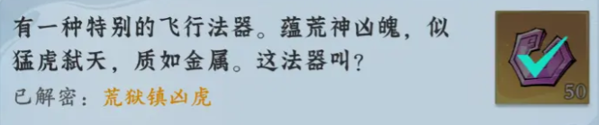5、有一种特别的飞行法器。蕴荒神凶魄,似猛虎弑天,质如金属。这法器叫?荒狱镇凶虎