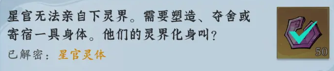 6、星官无法亲自下灵界。需要塑造、夺舍或寄宿一具身体。他们的灵界化身叫?星官灵体